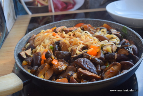 4. Taiteii se fierb conform instructiunilor de pe pachet, se scurg si se adauga in tigaia cu ciuperci, legume si sos asiatic delicios.