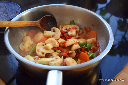 - Legumele se toaca, se trag la tigaie in putin ulei la foc iute. Le lasam sa sfaraie maxim 2 minute la foc mare.