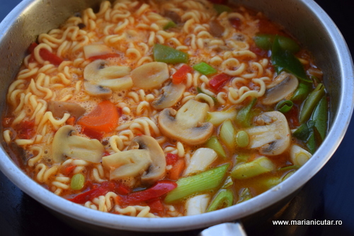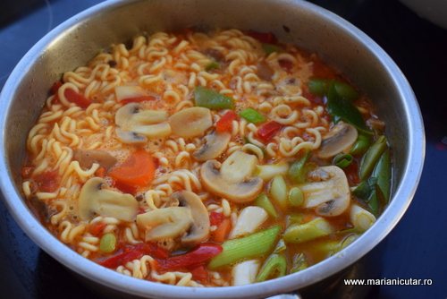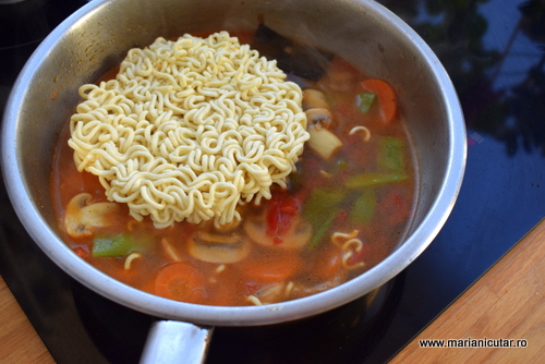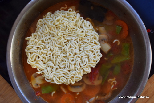 - Adaugam sos de soia, sos de chili, ghimbir, usturoi pisat marunt si taiteii ramen direct din punga, nefierti.