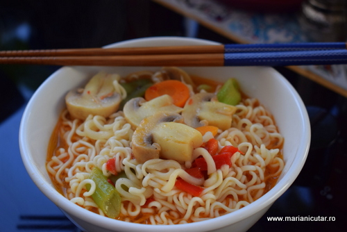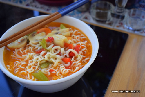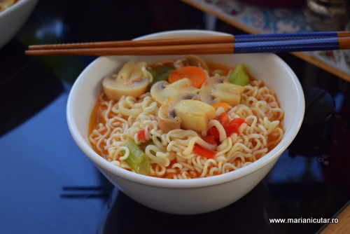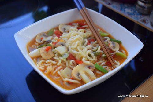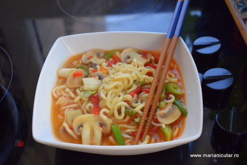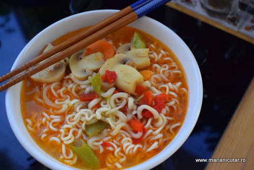 Iata ce ingrediente puteti folosi pentru a pregati legume asiatice cu taitei ramen si sos chili: