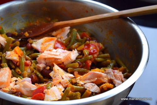 4. Adaugam somonul peste legume si amestecam incet. Nu vrem sa face somonul praf ci doar sa il maruntim putin.
