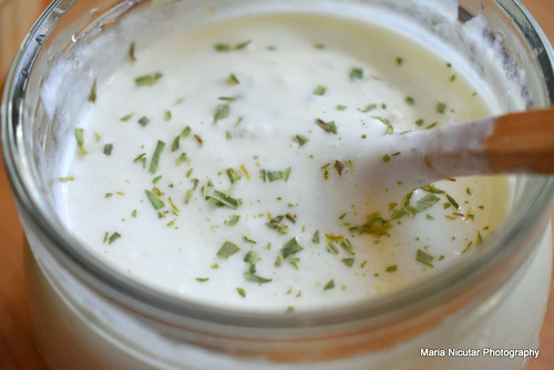 - Pregatim sosul de iaurt din usturoi pisat marunt, sare, piper, verdeturi aromatice, ulei si iaurt. Formam mujdeiul si apoi punem restul ingredientelor.