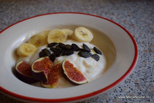 Cam cate calorii sa avem intr-o portie ca cea de mai sus? In jur de 250 de kcalorii are o astfel de portie, in functie de ce tip de iaurt cumparati si cate fructe folositi. Eu am folosit cam 150 de grame de iaurt per portie si jumatate de banana + jumatate de smochina + 2 linguri de seminte de dovleac.