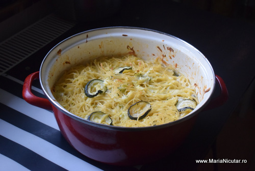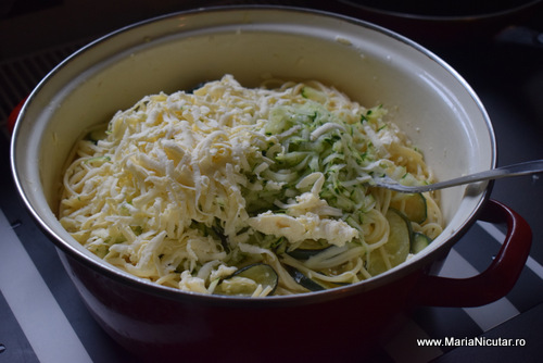 - Puneti pastele intr-un vas de cuptor. Adaugati ouale batute bine, dovlecel taiat felii sau dat pe razatoare, untul si telemeaua data pe razatoare.