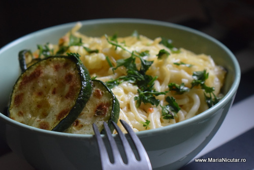 Este o mancare delicioasa, ceva nou, un preparat original. L-am descoperit din greseala, intr-o zi in care aveam dovlecei la gratar iar budinca de paste mi s-a parut prea goala si trista. Am combinat budinca de paste cu dovlecei si cu verdeata proaspata iar efectul a fost minunat.
