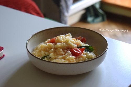 Ideea de a pune rosiile la final mi-a venit odata cand mi-am dat seama ca uitasem sa le pun si deja stinsesem focul. Si am zis ca as putea sa risc, sa vad ce se intampla daca le pun in orezul deja gatit si sa nu mai dau inapoi pe foc. Si a iesit ceva delicios. Dar am rosii de gradina, rosii romanesti foarte gustoase. Si busuiocul este grecesc, dintr-un soi adus de prieteni buni si pe care am reusit sa il prind la gradina, la curte. Este absolut delicios.