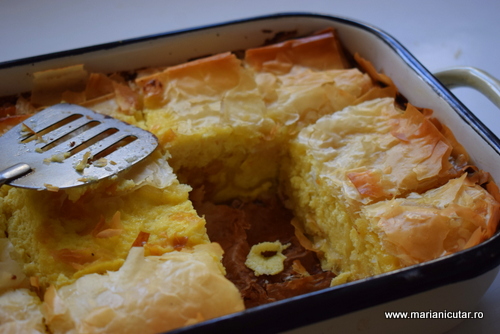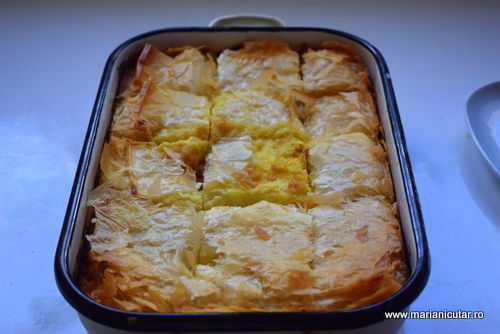 5. Ultimul strat poate fi de foi, pe care le ungem cu putin ulei. Sau ultimul strat poate fi de compozitie de iaurt. Nu e gresita niciuna dintre optiuni. Rezultatul difera 🙂
