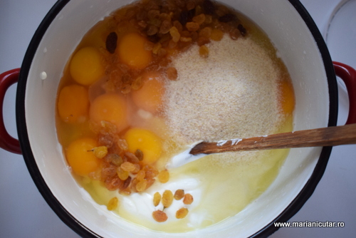 2. Adaugam iaurtul, grisul, zaharul, zaharul vanilat, stafidele, uleiul. Amestecam bine.