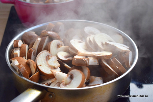 - Ciupercile isi lasa apa loc. Nu adaugati apa deloc. Doar lasati focul mic pana cand incep ele sa zemuiasca.