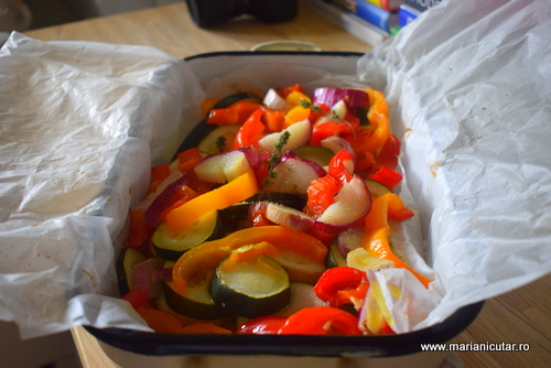 - Apoi pun foaie de cuptor in tava de cuptor si pun legumele inauntru.