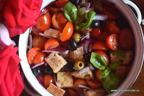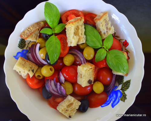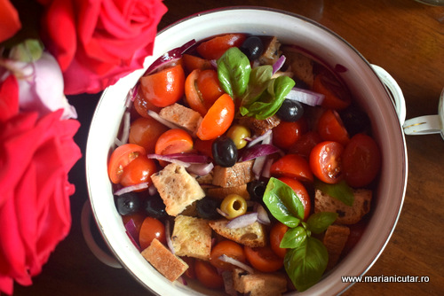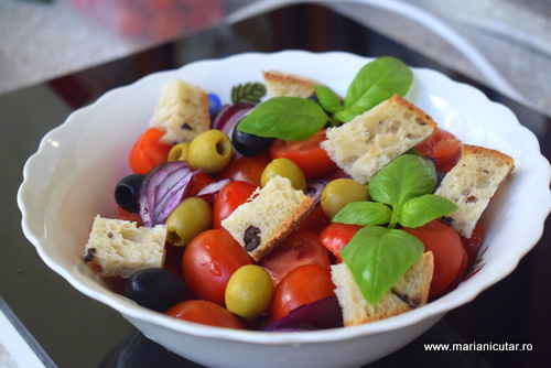 Atat pentru azi. V-am lasat mai sus reteta de salata siciliana, o salata originara din Sicilia, unde era considerata mancarea omului de rand, o mancare modesta, in care gospodinele puneau rosii crescute in gradina, niste paine veche, uscata si cateva frunze de busuioc, plus uleiul de masline pe care orice gospodarie si-l producea.