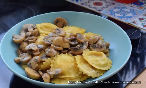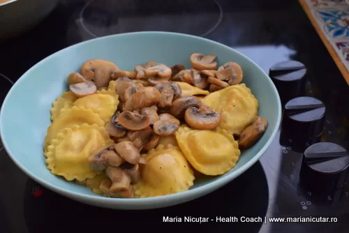 Ravioli cu ciuperci si usturoi 🙂 Cine ar refuza o portie generoasa din aceasta mancare italieneasca delicioasa si super hranitoare? Eu nu voi refuza niciodata o portie de paste, in principiu pentru ca eu iubesc pastele si apoi pentru ca sunt hranitoare si satioase. Mai mult, sunt facute din faina, apa si sare, asa ca sunt cat se poate de sanatoase, lasand la o parte conspiratia cu faina care e mai periculoasa decat ne imginam… Daca e asa, nu mai mancam nimic. Ne ascundem intr-o casa de la munte, traim ca oamenii padurii, mancam doar radacini si bem apa de izvor. Eu una prefer sa mananc si paste, mananc si zahar, totul cu moderatie, nimic in exces.