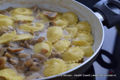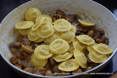 - Punem capacul peste oala si lasam ravioli sa fiarba impreuna cu ciupercile.