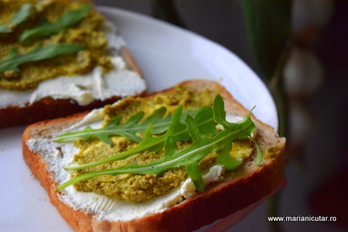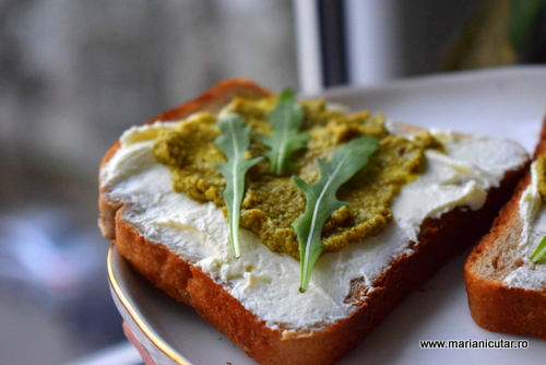Feliile de paine se ung cu branza de vaci, adaugam o lingurita de pesto proaspat facut in casa sau de la borcan, plus frunze de rucola 🙂 Va asigur ca veti iubi aceasta gustare din cauza careia nu va veti ingrasa si nici nu veti rabda de foame. Are aport mare de proteine, grasimi sanatoase si fibre care asigura satietate.