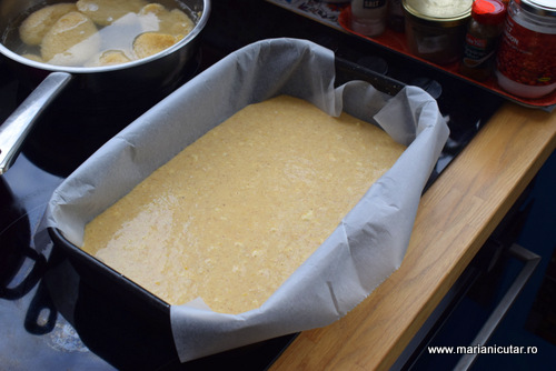 - Dam amestecul la cuptor intr-o tava tapetata cu hartie de copt.