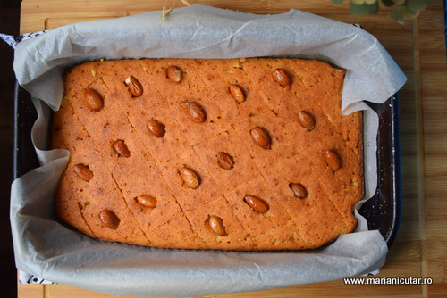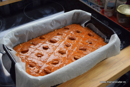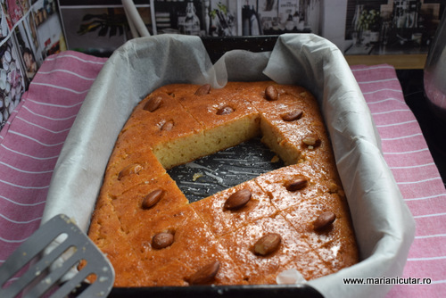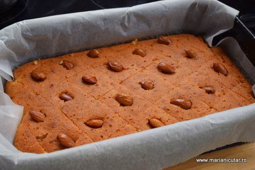 - Revani se taie usor cu cutitul si pe fiecare trigon rezultat vom pune cate o migdala. O apasam putin si intra in prajitura, caci este moale si pufoasa.