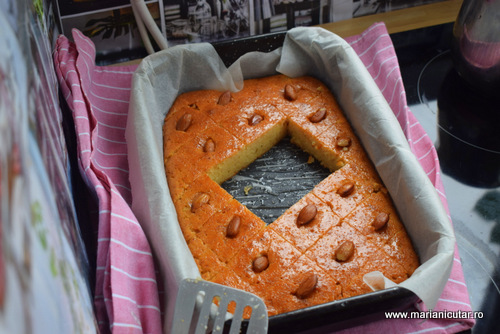 Unele retete de Basbousa si de Revani au nevoie de razatura de cocos. Eu nu am avut la indemana asa ca nu am pus. Am completat cu gris cat sa imi iasa o compozitie destul de consistenta. Nu credeam ca va iesi asa de buna dar a iesit minunat, lucru care ma duce cu gandul la faptul ca uneori este si norocul incepatorului :)) Sa vedem, caci am de gand sa repet reteta si sper sa iasa cel putin la fel de bine ca de data asta, cu exceptia faptului ca voi portiona prajtura inainte de a o pune in cuptor si tot atunci voi pune si migdalele.