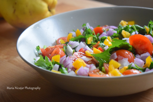 Inca o salata pe care cred ca o veti iubi: rosii cherry, patrunjel, ceapa rosie, ardei gras galben, ulei de masline, zeama de lamaie sau otet, sare si piper. Se prepara la fel de rapid, special pentru gospoDIVE 🙂