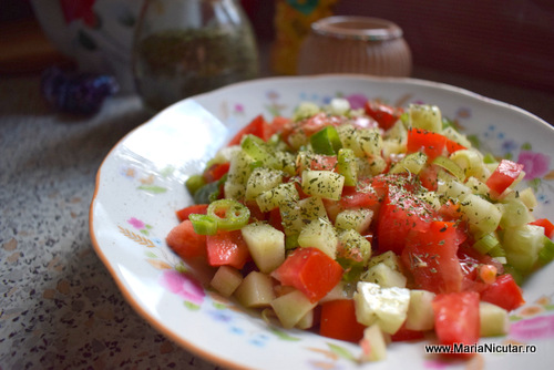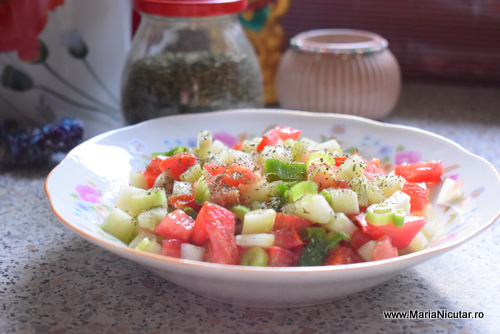 Iata si ingredientele de care aveti nevoie pentru o salata taraneasca delicioasa, una pe care am descoperit-o de curand in vizita la o prietena: