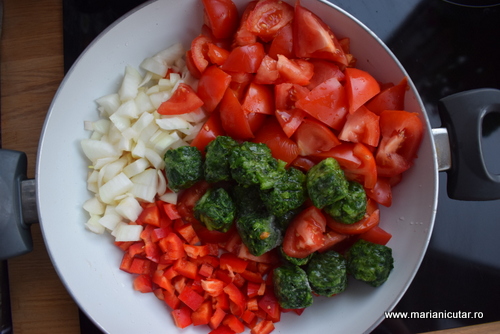 - Punem aceste trei ingrediente intr-o tigaie adanca si adaugam si spanacul congelat. Stropim cu ulei de masline si dam focul mic.