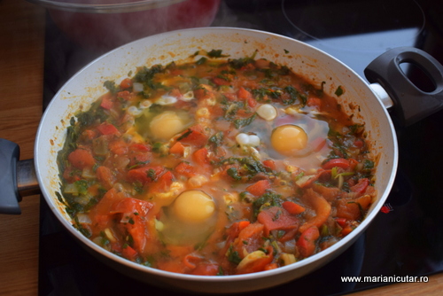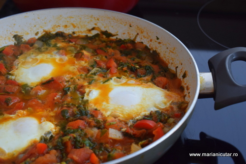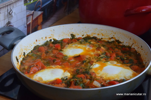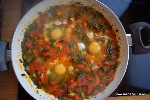 - Cand sosul de rosii e format si miroase divin, dam focul mic si facem cateva adancituri in tigaie. Aici punem ouale cu grija.