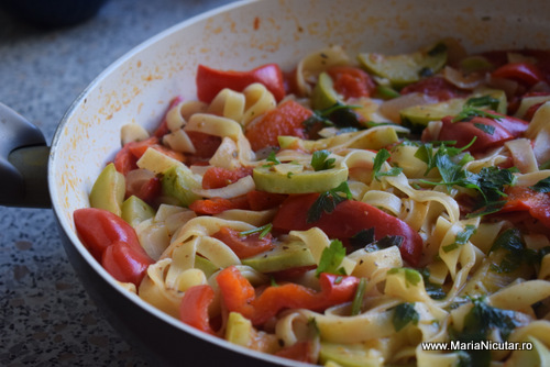 - Adaugam rosiile tocate marunt si un polonic de apa de la pastele deja fierte. Focul sa fie mic. Lasam rosiile sa scada.