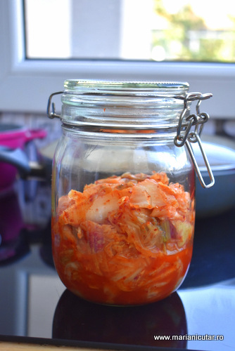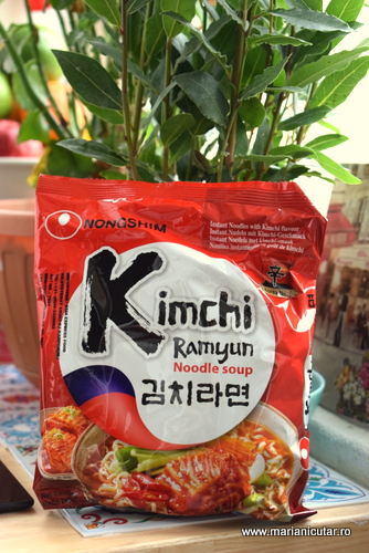 Kimchi – este varza murata in stil asiatic, cu sos de soia, sos de peste, boia de ardei, sos de chili, ghimbir si alte ingrediente specific asiatice. Eu cumpar kimchi de la magazinele cu mancare asiatica si este intotdeauna un ingredient perfect de pus in legumele trase la tigaie sau in supele asiatice picaaaante 🙂