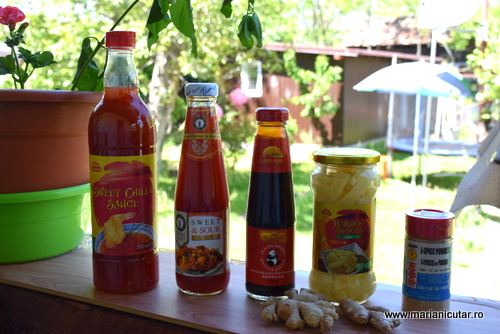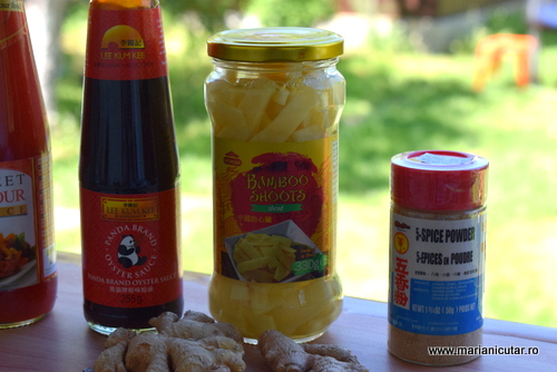 Mai jos aveti sos de chilli, sos dulce acrisor, sos de stridii, muguri de bambus, 5 Chinese Spices, ghimbir. Daca le aveti pe acestea in bucatarie, sunteti 100% siguri ca puteti pregati mancare asiatica sanatoasa si delicioasa.