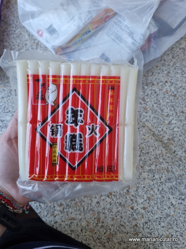 Rice cakes – orez fiert si rulat sub forma de tuburi groase 🙂 Se fierb in apa cu putina sare, la fel ca taiteii de orez. Apoi se combina cu sosuri asiatice si legume trase la tigaie in stil asiatic, cu ulei de susan, condimente specifice, ardei iute samd.